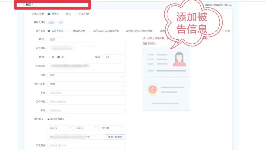 6.填写被告信息。将当事人类型、姓名、证件号码、性别、户籍地址、民族、常住地址等信息填写完整。