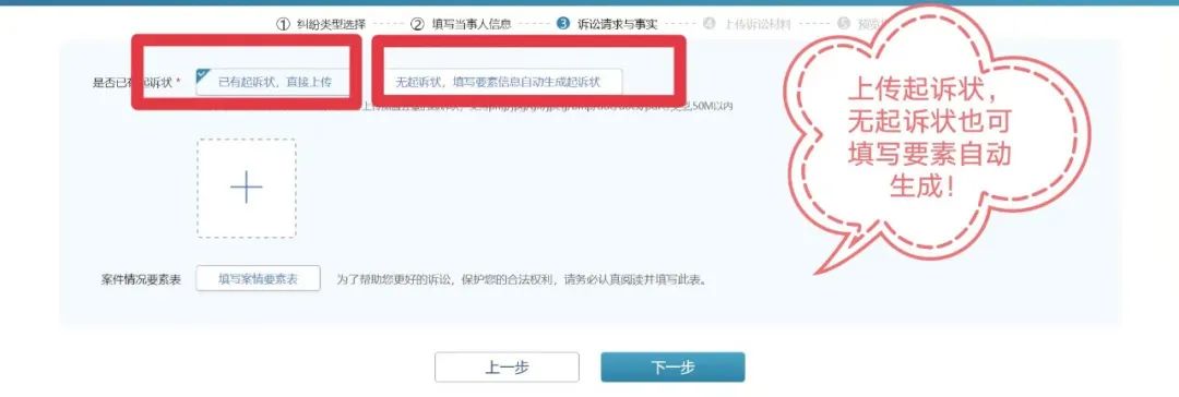 7.上传起诉状。如已有起诉状,请选择直接上传;无起诉状,请填写要素信息自动生成起诉状。生成起诉状后请直接下载,将打印好的起诉状,上传至系统!