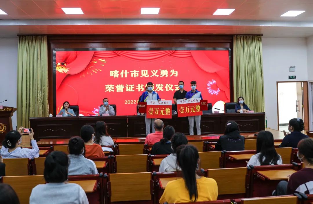 见义勇为、救人于危难是中华民族的传统美德和宝贵精神财富,是精神文明建设和公民道德建设的重要内容。为4位“喀什市见义勇为先进个人”颁奖的市政法委常务副书记张生泉说:“全市各族干部群众要以见义勇为群体和个人为榜样,大力倡导良好社会风尚,积极关心、支持、参与见义勇为,形成互帮互助的良好社会风气,各乡镇街道、各单位各部门要采取有力有效措施开拓见义勇为先进群体和个人奉献精神,切实维护见义勇为人员及家庭的合法权益,进一步促进见义勇为事业持续健康发展,为促进全市经济社会健康发展、维护社会稳定和长治久安作出新的更大贡献,以优异的成绩迎接党的二十大胜利召开。”(喀什市融媒体中心记者:李彩琴 实习生:田新)
