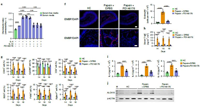 研究团队进一步深挖疾病的致病机理和治疗靶点。结果显示,ALOX15+巨噬细胞是影响和调节eCRSwNP疾病发生发展的关键节点。在嗜酸性鼻窦炎小鼠模型实验中发现,应用ALOX15抑制剂可有效降低细胞因子IL-4、IL-5、IL-13以及血液中IgE水平,缓解2型炎症,对嗜酸性鼻窦炎产生很好的疗效(见下图),提示ALOX15有望成为治疗eCRSwNP的新药物靶点。