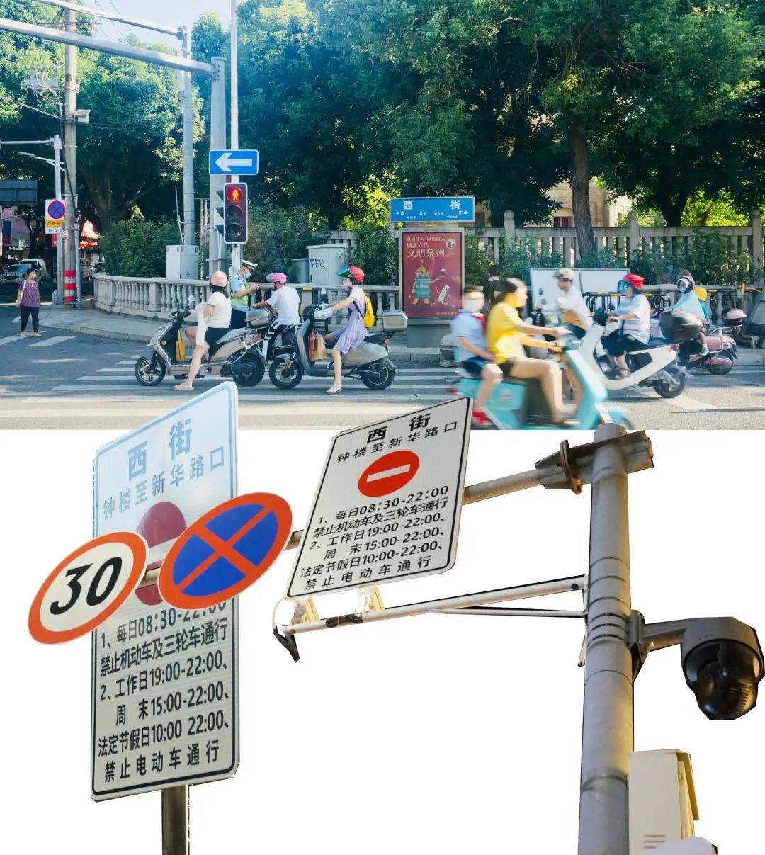 因此,强调「游客友好」的泉州西街路口杆上,挂起显眼的限行要求。规定西街东段(钟楼至新华路口)除了限制机动车出行时间外,还包括: