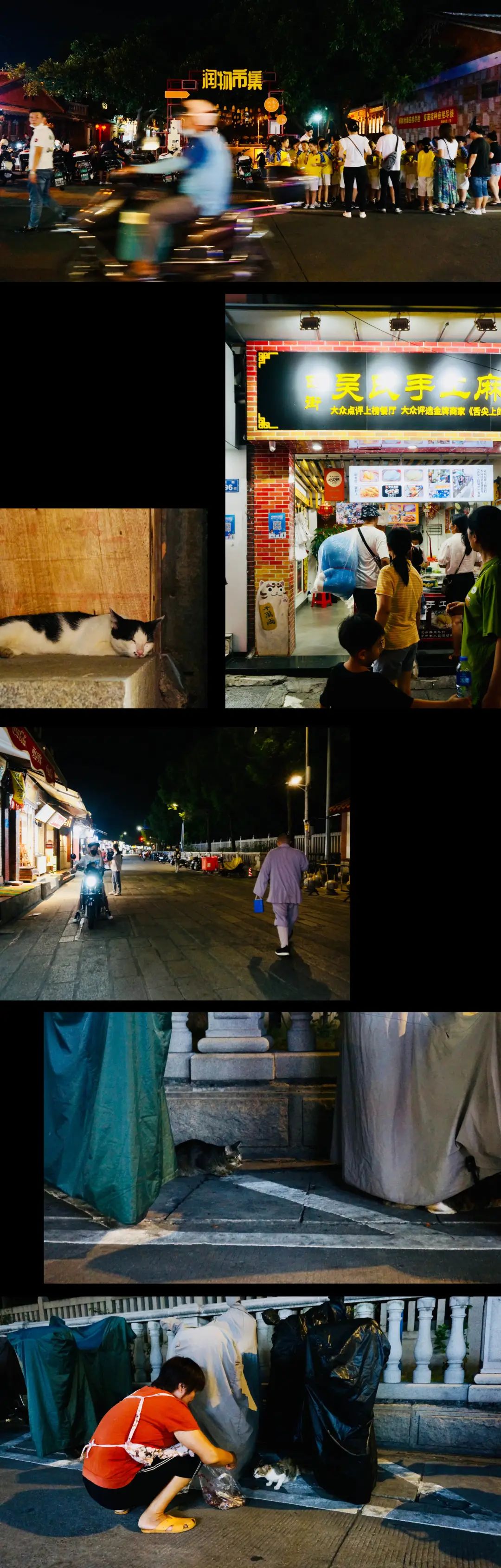 继续向西,行人逐渐稀疏。路上一个僧人拎着蓝色小包从开元寺正门前走过。黑白相间的猫横在角落里睡得笔挺,还有两只藏在电瓶车下激烈对峙,嘴巴发出警告的咕噜声。对面「翠妈妈古早味」的老板拎一兜子肉,穿过马路来犒赏两位吵得正欢的猫仔。其中一只并不躲避,坦然接受。老板娴熟地掏出肉丢给猫,看来TA们也是「熟人」。