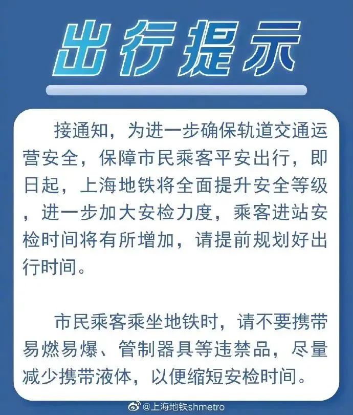 上海地铁特别提醒:市民乘客乘坐地铁时,请不要携带易燃易爆、管制器具等违禁品,尽量减少携带液体,以便缩短安检时间。