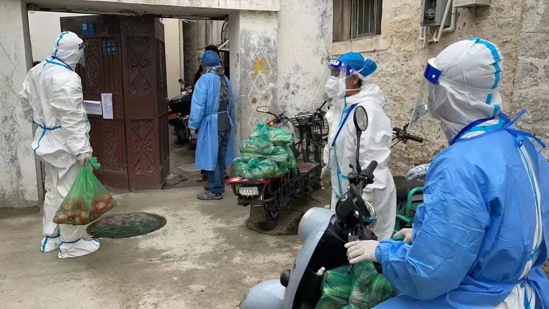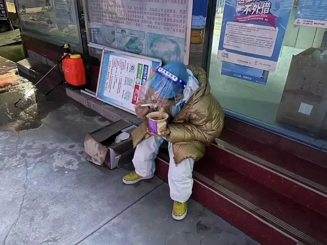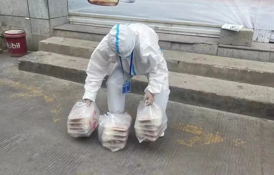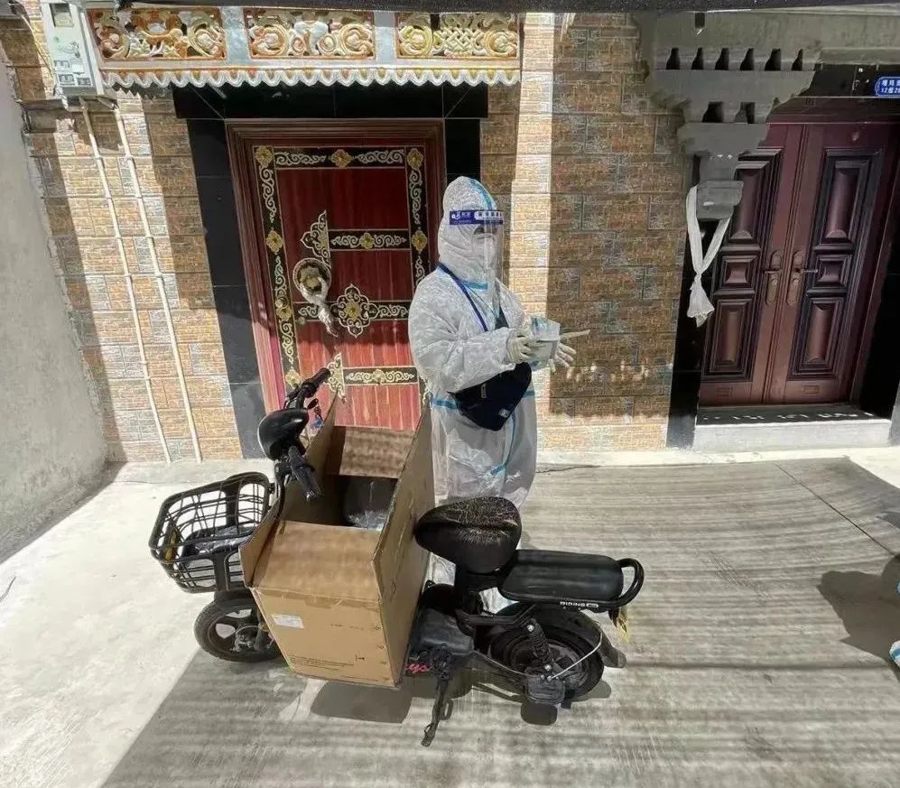 在无特殊情况下,次仁拉姆和队友们一般都是凌晨 2 点多开始配菜打包,打包完毕差不多6点左右,又开始挨家挨户地送,送完后稍作休息又开始送药品。这期间她印象最深刻的就是有一天早上五点她和同事简单吃了点东西便和医生一起入户上门给抗原结果异常的居民做核酸,一早上做了几十户,做到了中午。为了避免感染,她和同事没有吃午饭,想坚持到当天的工作结束了直接把防护服换下再进食,那一天下午他们又开始送物资分药品的工作,一直到凌晨3点才吃了一桶泡面。