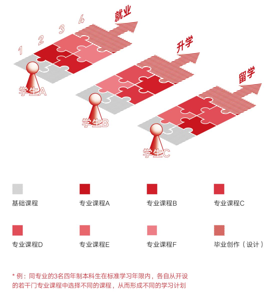 为保证“学分制”教学管理模式与学校原有的“学年学分制”教学管理模式的顺利过渡,充分考虑各学科专业教学方式与教学资源之间的差异性,我校设计学、戏剧与影视学、艺术学理论三个学科和工业设计专业率先推行“完全学分制”教学管理模式,其他专业将于2023年启动实施。