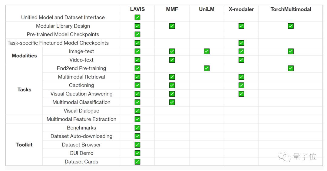 如果还不能看不出它的优势,那话不多说,直接看LAVIS与现有多模态库的对比图。