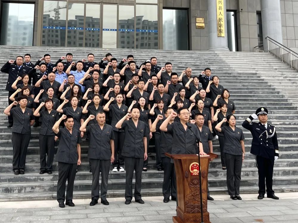 升旗礼毕,国徽高悬,国旗庄严,宣誓台上摆放着《中华人民共和国宪法》。党组书记、院长许元峰左手抚按宪法,右手握拳,领诵誓词。全体干警整齐列队,跟诵誓词。