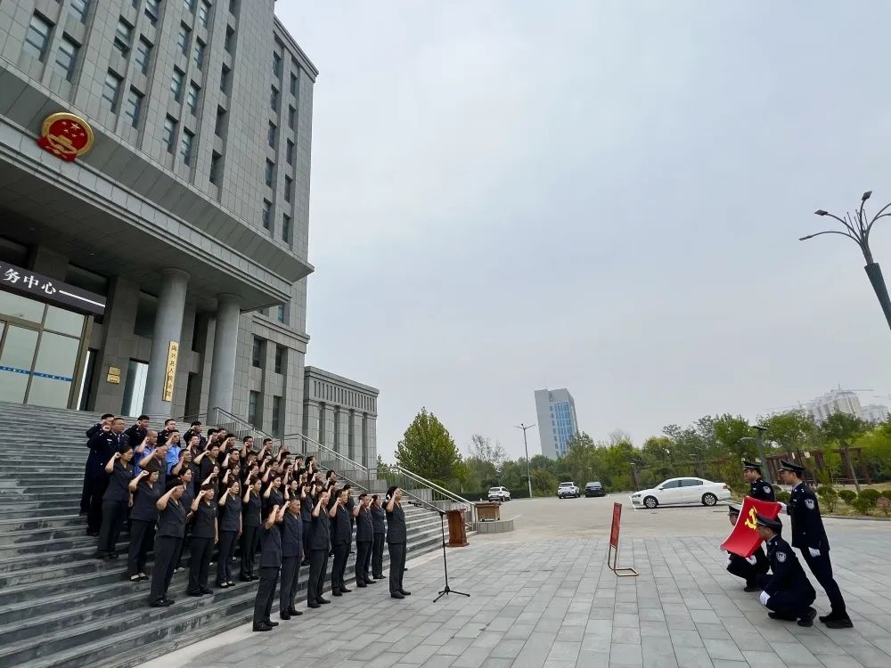 宪法宣誓完毕后,许元峰院长带领全体党员干警重温入党誓词。大家举起右手共同宣誓,在“我志愿加入中国共产党,拥护党的纲领,遵守党的章程……”宣誓声中回望入党初心,感受共产党人为共产主义事业奋斗终身的决心,升华对党和国家的情感,提振干事创业的精气神。