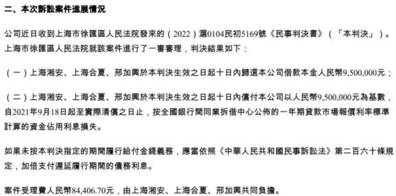上海湘安、上海合夏、邢加兴于本判决生效之日起十日内偿付公司以950万元为基数,自2021年9月18日起至实际清偿之日止,按全国银行间同业拆借中心公布的一年期贷款市场报价利率标准计算的资金占用利息损失。案件受理费8.44万元,由上海湘安、上海合夏、邢加兴共同负担。