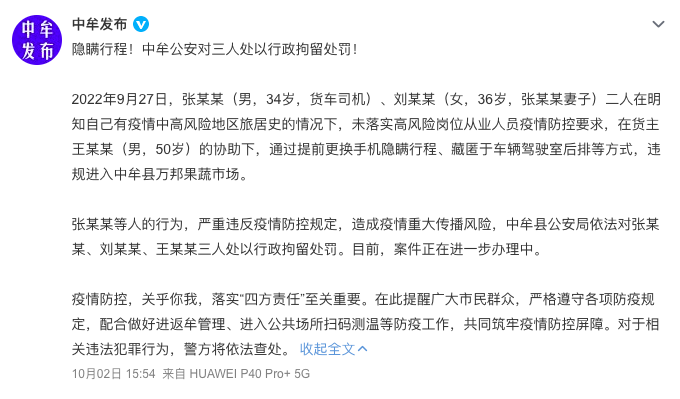 通报称,2022年9月27日,张某某(男,34岁,货车司机)、刘某某(女,36岁,张某某妻子)二人在明知自己有疫情中高风险地区旅居史的情况下,未落实高风险岗位从业人员疫情防控要求,在货主王某某(男,50岁)的协助下,通过提前更换手机隐瞒行程、藏匿于车辆驾驶室后排等方式,违规进入中牟县万邦果蔬市场。张某某等人的行为,严重违反疫情防控规定,造成疫情重大传播风险,中牟县公安局依法对张某某、刘某某、王某某三人处以行政拘留处罚。目前,案件正在进一步办理中。