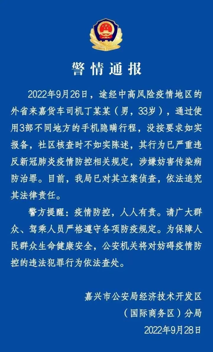 根据嘉兴市公安局经济技术开发区分局消息,2022年9月26日,途经中高风险疫情地区的外省来嘉货车司机丁某某(男,33岁),通过使用3部不同地方的手机隐瞒行程,没按要求如实报备,社区核查时不如实陈述,其行为已严重违反新冠肺炎疫情防控相关规定,涉嫌妨害传染病防治罪。目前,嘉兴市公安局经济技术开发区分局已对其立案侦查,依法追究其法律责任。