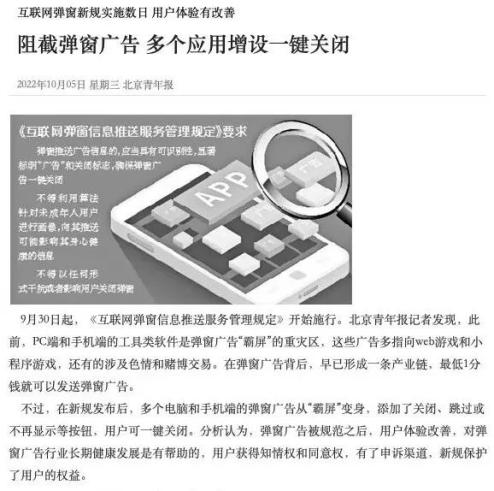 ☞互联网弹窗新规实施数日,用户体验有改善。近日,《互联网弹窗信息推送服务管理规定》开始施行。在新规发布后,多个电脑和手机端的弹窗广告从“霸屏”变身,添加了关闭、跳过或不再显示等按钮,用户可一键关闭。分析认为,弹窗广告被规范之后,用户体验改善,对弹窗广告行业长期健康发展是有帮助的,用户获得知情权和同意权,有了申诉渠道,新规保护了用户的权益。(北京青年报)