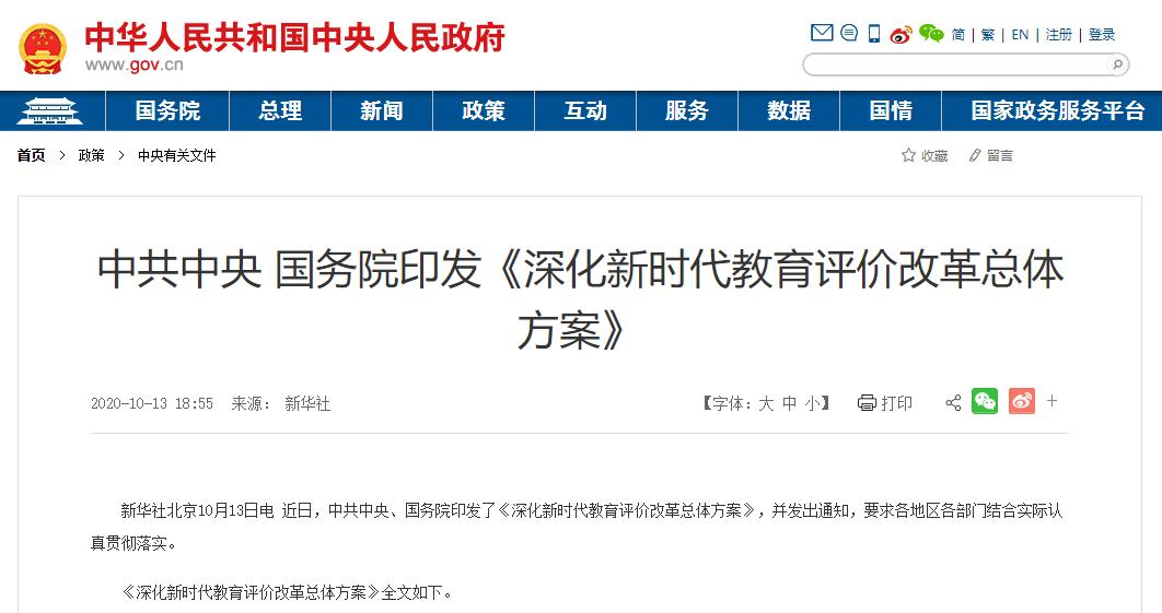 2020年10月13日,国务院印发《深化新时代教育评价改革总体方案》,提出各级公务员招录、事业单位和国有企业招聘要按照岗位需求合理制定招考条件、确定学历层次,在招聘公告和实际操作中不得将毕业院校、国(境)外学习经历、学习方式作为限制性条件。