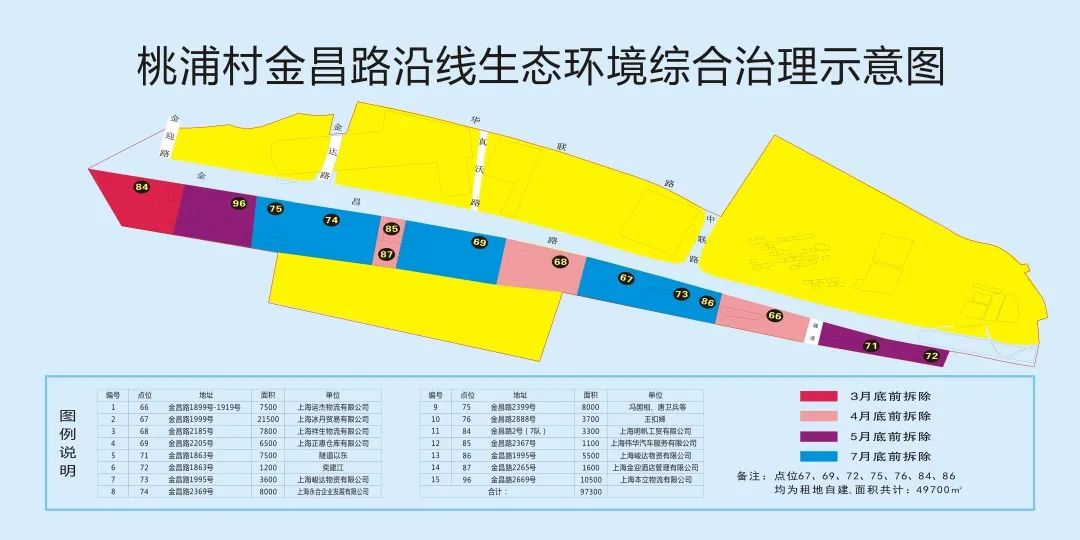 “金昌路沿线生态环境综合治理工作量大、面广,经营主体众多,还涉及村集体资产和劳动力安置等多方面问题,压力巨大。”朱小燕说,为了顺利完成清退任务,工作人员冒着连续40度的高温天,挨家挨户上门做工作,晓之以理、动之以情。有些“硬骨头”,更是由桃浦村党总支书记、村委会主任金卫东亲自带队协调解决。为了替企业找寻合适的安置场地,村干部甚至奔赴外区协调厂房资源。同时,综合治理工作也得到了桃浦镇党委、政府的全力支持,通过协调区整治办、组织镇拆违办及镇综合行政执法队等职能部门进驻金昌路综合整治指挥部,桃浦村拆违工作得以有序推进。当年8月20日,桃浦村金昌路沿线租户清退工作全部完成,拆除违法建筑13.68万平方米,为桃浦生态环境治理起到示范带头作用。