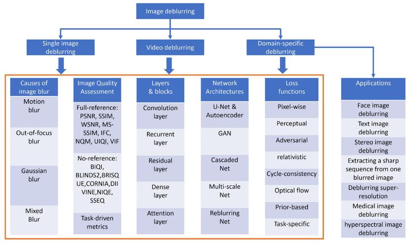 2. 讨论了近些年基于深度学习在图像去模糊领域中取得的进展,对当前的深度去模糊方法进行全面回顾。