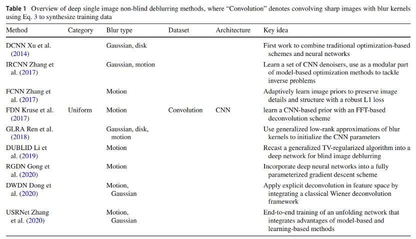 一些基于非深度学习的方法通常使用自然图像先验,例如全局或者局部图像先验,在空间域 或频域中重建清晰的图像。为了恢复出更好的图片,近些年,一些基于空间反卷积和深度神经网络的方法相继被提出。本文在下面表格中总结了现有的基于深度学习的非盲方法,这些方法可以大致分为两组:第一组是基于反卷积去噪,而第二组是基于先验去噪声: