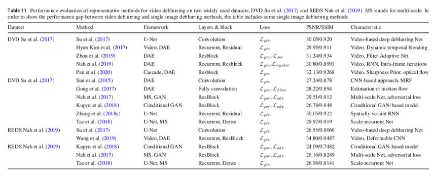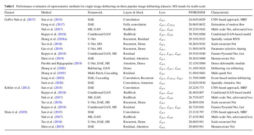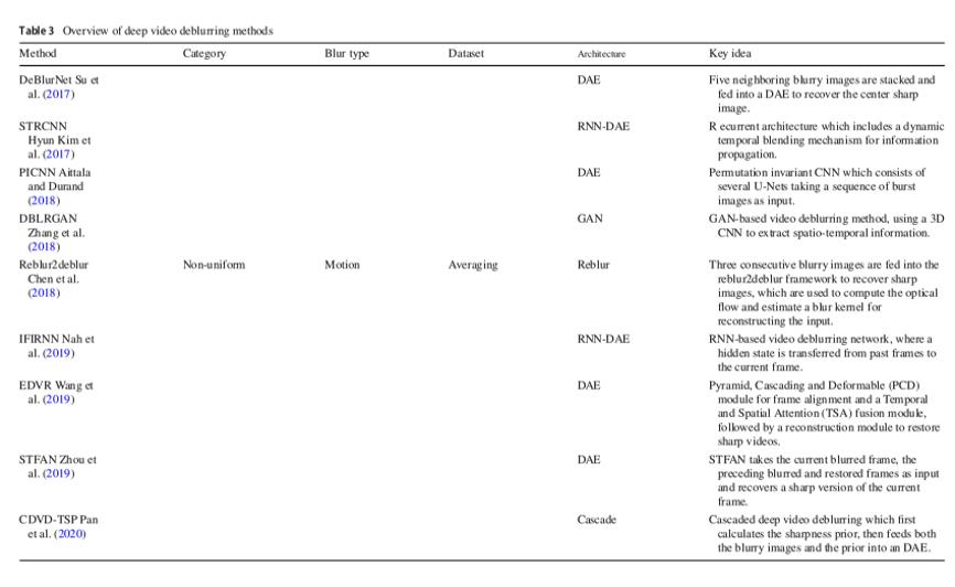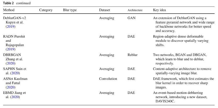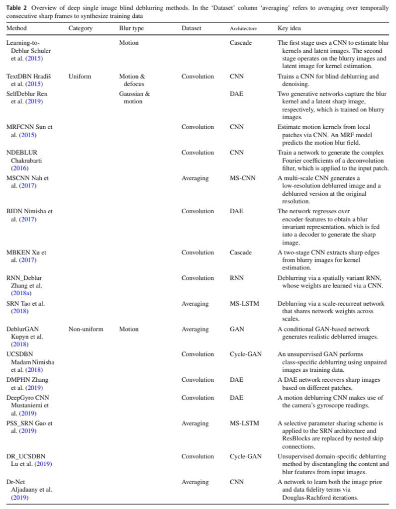 当模糊图的模糊核未知时,图像去模糊任务被称为盲图像去模糊。早期的盲图像去模糊方法侧重于去除均匀的模糊核。然而,真实世界的模糊图像,其不同区域通常是由不同的模糊核生成,因此其模糊核是非均匀的。为了解决盲图像的去模糊任务,多种基于深度学习的图像去模糊算法被提出。本文在下面表格中总结了现有的基于深度学习的盲图像去模糊方法,这些方法通常采用各种不同的网络框架,包括多尺度网络、对抗神经网络、级联网络、再模糊网络等等。