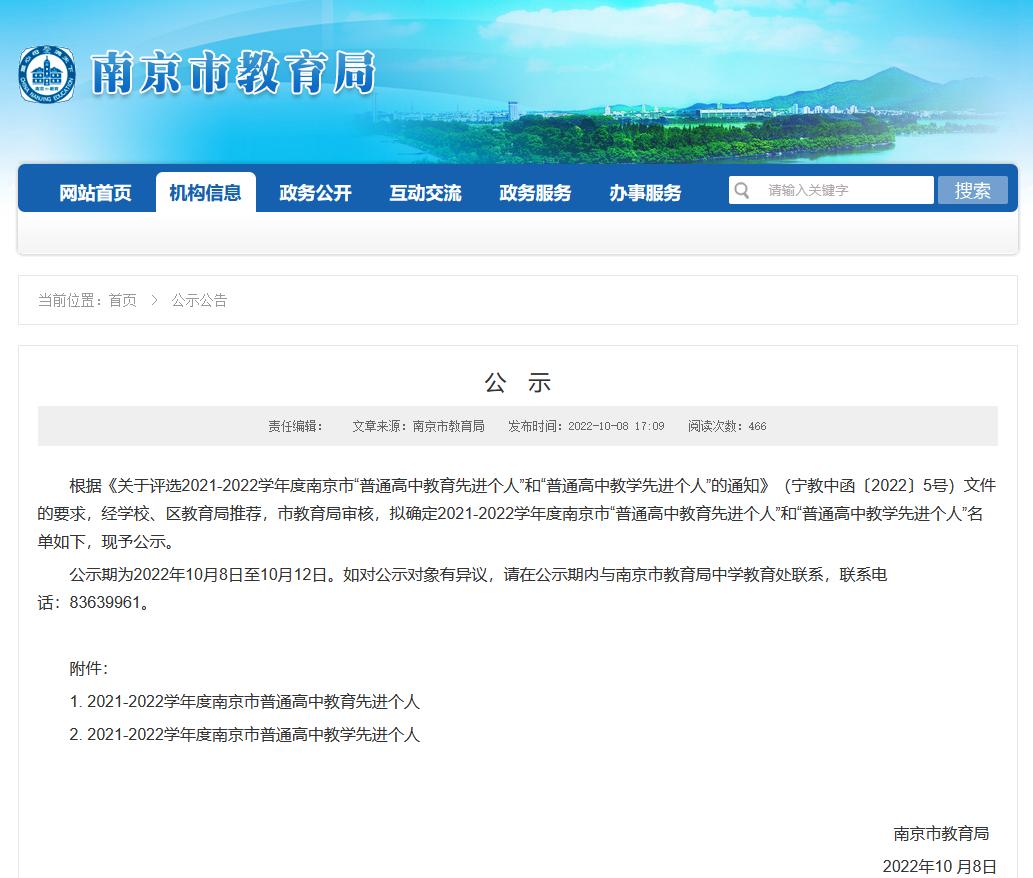 根据《关于评选2021-2022学年度南京市“普通高中教育先进个人”和“普通高中教学先进个人”的通知》(宁教中函〔2022〕5号)文件的要求,经学校、区教育局推荐,市教育局审核,拟确定2021-2022学年度南京市“普通高中教育先进个人”和“普通高中教学先进个人”名单如下,现予公示。