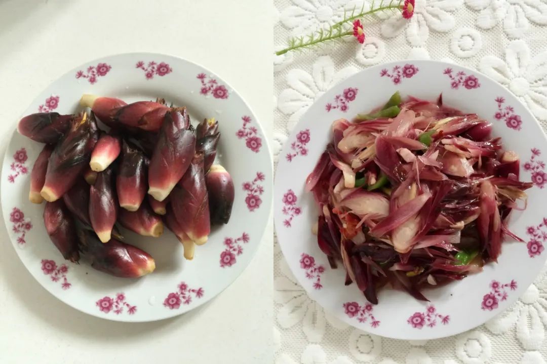 左为新鲜蘘荷,右为炒蘘荷 | 豆果美食@果妈私房菜