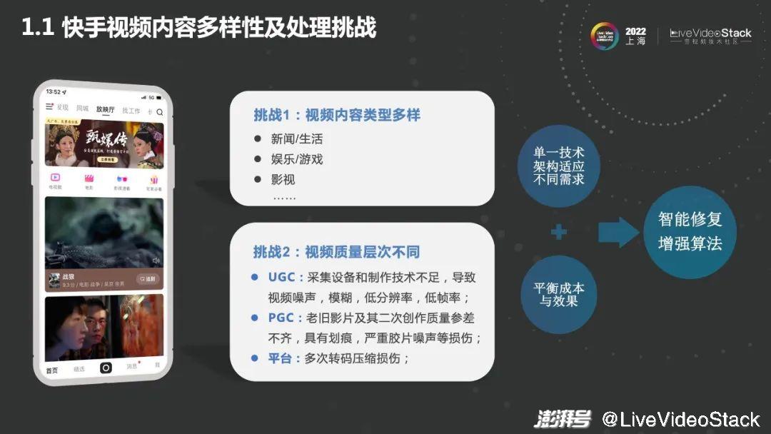 编者按:快手平台上视频类型繁多,且视频源的画面质量存在较大差异。“面对种类多且质量差异较大的视频,如何让用户获得更清晰的观看体验?”对于这一问题,快手音视频技术团队深入研究智能音视频修复及增强处理等相关技术,打造“快手质臻影音”,为用户提供极致视频体验。本次LiveVideoStackCon 2022上海站大会,我们邀请到了快手音视频高级算法工程师何刚老师,为我们分享了快手平台视频多样性和处理挑战;针对这些挑战提出的智能修复和增强算法;以及质臻影音的落地方案。