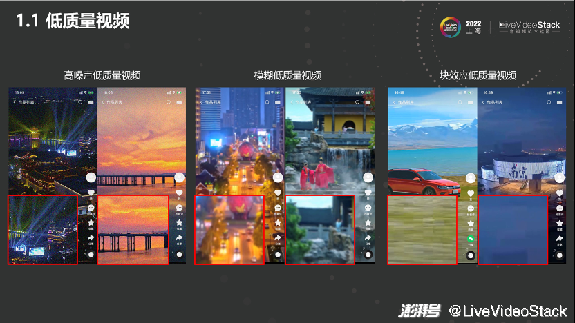 第二是视频质量的参差不齐,千万量级的视频中,有些制作精良,但也有很多素材制作不佳。首先,针对UGC来说,用户的手机机型存在差异,且在视频制作的过程中,用户有时会加入一些非拍摄素材,制作技术也非专业级别,这些因素都会导致视频存在噪声、模糊、低分辨率、低帧率等问题。其次,即使PGC作品也会存在一些问题,如在视频二次创作过程中,制作水平的差异化造成视频质量参差不齐,并且对于老旧影片还存在划痕、严重胶片噪声等损伤。此外,视频还会经历多次转码压缩损伤,用户在拍摄时就会有第一次编码,之后如果用户再进行多次编辑,这就意味着多次损伤,当用户把视频上传时,平台也需要做转码工作——这样一个叠加操作过程下来,视频会经历多次转码压缩损伤。