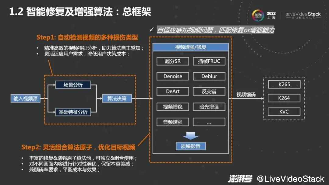 第二步是快手智能感知增强修复原子算法池中进行自动增强算法处理,包含超分、插帧、去噪、去模糊、区块效应、反交错、视频增稳、音频增强等。我们将根据第一步视频质量检测结果,智能自动化决策出独立或组合使用增强处理算子,可以对不同的画质内容进行针对性调优,能够大幅提升画质和美感。此外,视频增强还需要与视频编解码(包括快手自研K264、K265和KVC)处理链路结合,最终需要呈现给用户消费最佳视频效果。