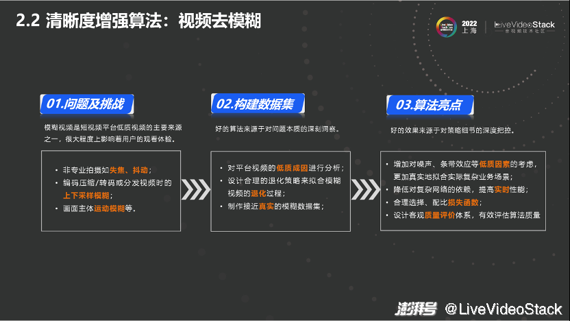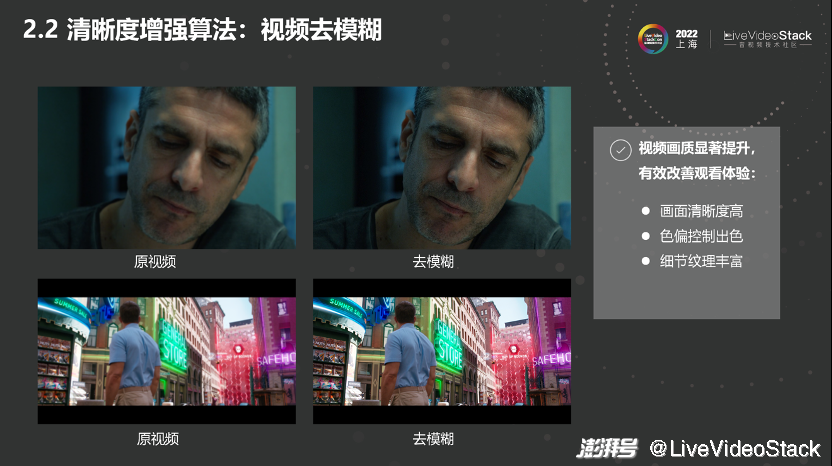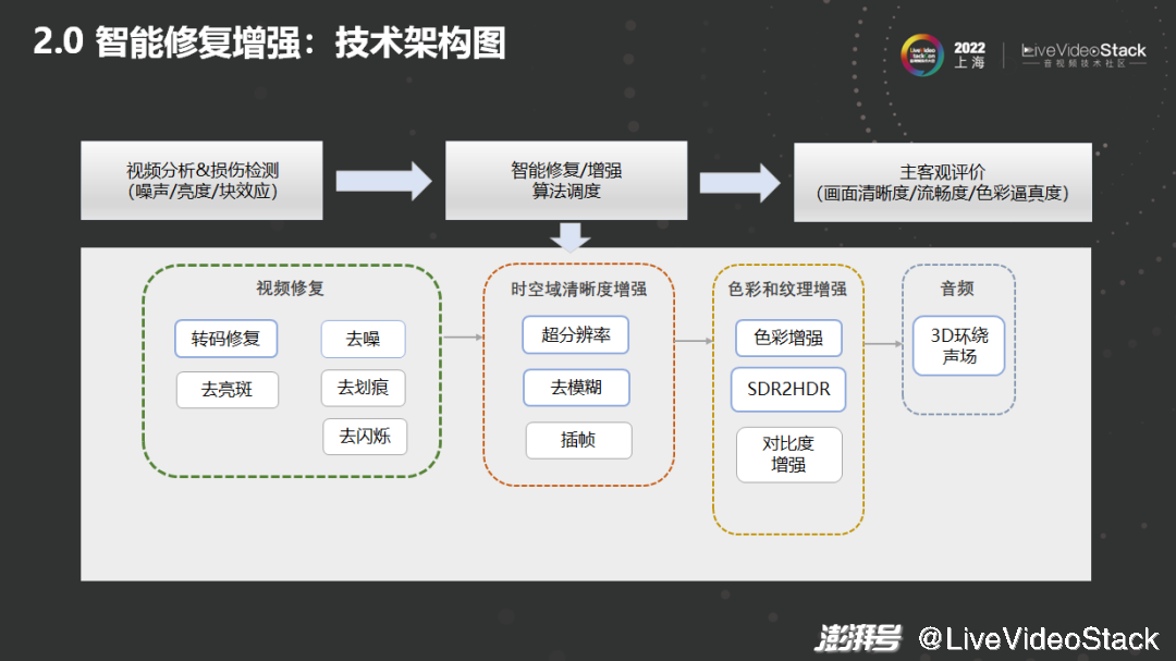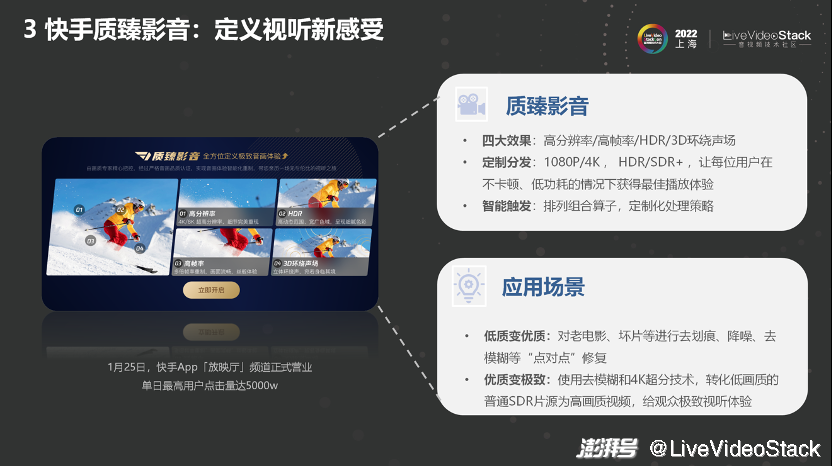最后介绍下,快手智能增强修复方案整合产品「质臻影音」的成功落地方案。2022年1月,快手质臻影音正式上线,包含高分辨率、高帧率、HDR、3D环绕声场这四大效果,能够排列组合刚刚提到的算子,定制化对视频进行提升,包含如下两方面:低质变优质,以及优质变极致。例如对老电影、破损影片进行去划痕、降噪、去模糊等“点对点”修复,主要针对低质量视频;对高质量视频,可以提升到极致效果,使用去模糊、4K超分辨率技术、HDR等达到极致的体验效果。