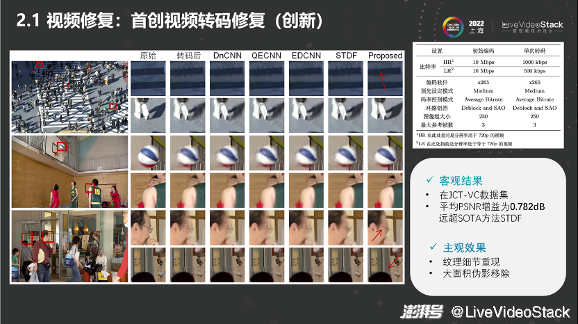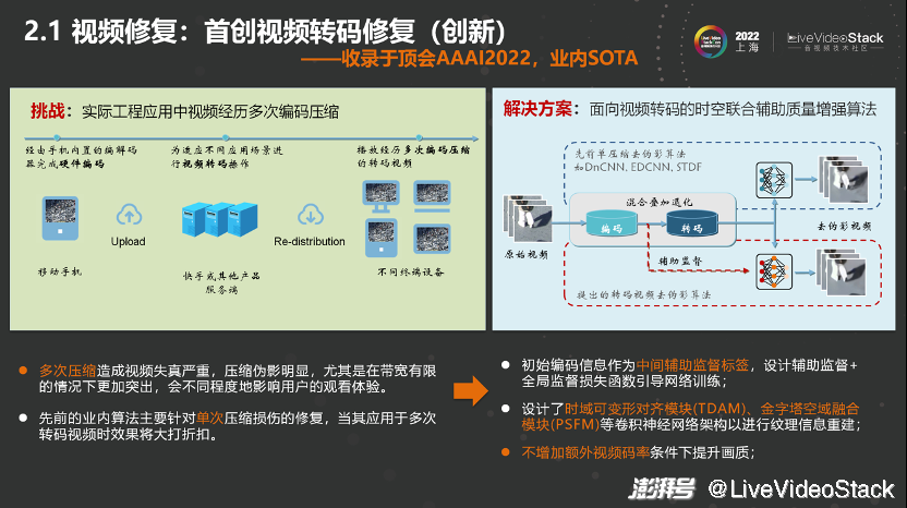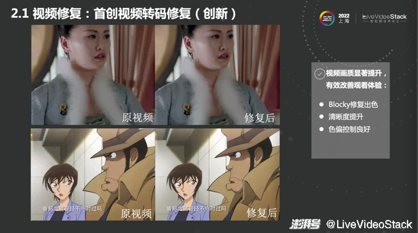 接下来讲述几个典型创新算法的基本原理和效果。首先来看自研创新修复算法,即首创视频转码修复算法。