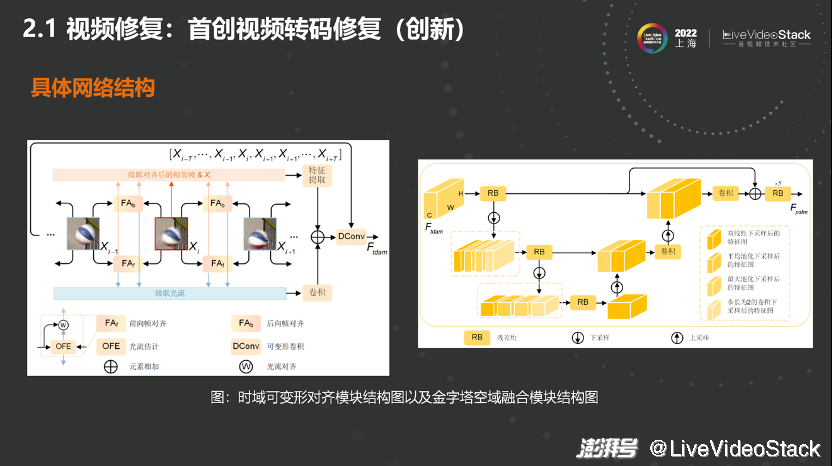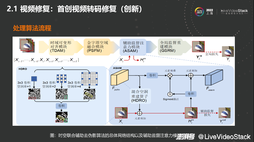 业内算法和修复解决方案均针对单次视频压缩损伤进行修复,如将其直接用在多次视频压缩上效果会大打折扣。我们提出的解决方案是面向视频转码的时空联合辅助质量增强算法,其一大亮点是在模型网络中设置辅助监督,在对修复过程训练中不只是从头部到尾部,而是将中间第一次编码后的结果作成中间级label并进行辅助监督,相当于把网络中前半部分进行引导。辅助监督和全局监督的损失函数是有一定比例的,整体引导网络训练。然后,我们设计了时域可变形对齐模块(TDAM)、金字塔空域融合模块(PSFM)等卷积神经网络架构以进行纹理信息重建,达到显著修复并提升画质效果。