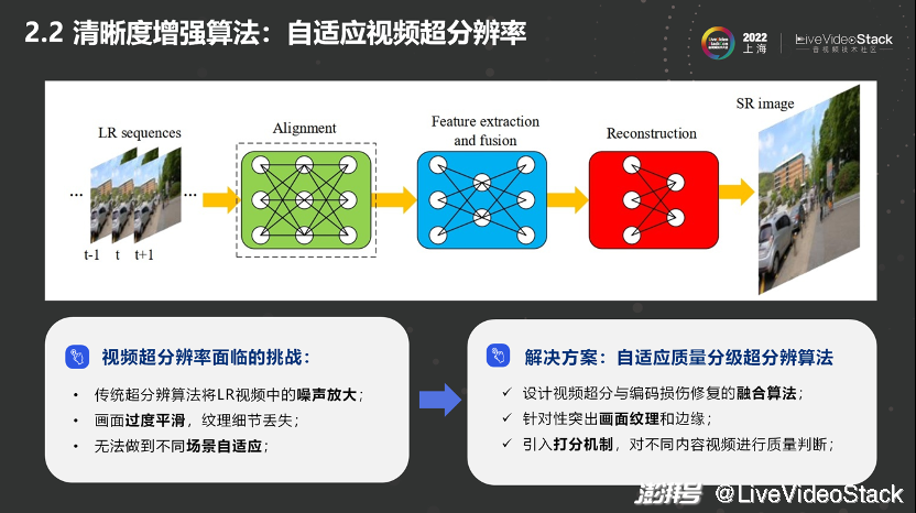 那么,超分辨率在面向工业应用有什么问题?首先,传统的视频超分辨率算法在提升纹理清晰度的同时将原小分辨率视频中噪声放大;其次,画面往往会变得过度平滑,丢失小细节和纹理,而将大区域画面处理偏平,这样画面看起来会有些偏假;第三就是一个网络很难去做好所有场景的自适应。这些就是我们需要解决的几个挑战。