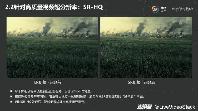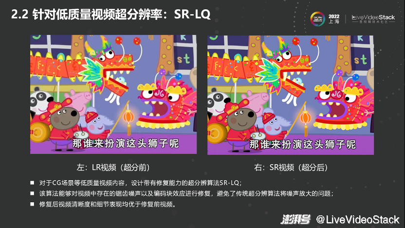 上图以SR-LQ为例,可以看到左图的分辨率低同时有很强的块效应。我们做超分辨率设计的核心是超分辩率能够做到抗锯齿,以及能够对块效应做到一定程度修复,避免传统超分辨率将分辨率变高的同时将块效应也变大的问题。