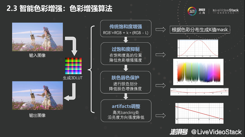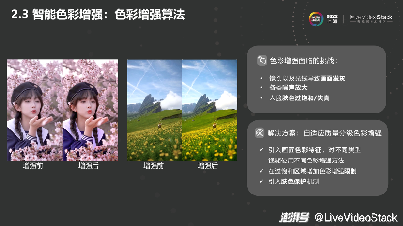快手智能色彩增强算法能够根据视频内容质量自动化增强并避免传统色彩增强容易引起的bad case。传统色彩增强算法往往增强色彩同时也存在较多bad case。首先噪声容易被放大;其次在肤色方面,人对人脸肤色非常敏感,用传统算法对全图进行色彩增强容易失真。因此,我们推出的相应解决方案,引入了画面色彩特征。由于每个视频对色彩增强程度需求不同,不能统一设定数值全部增强,所以对不同的视频采取自适应的色彩增强方案;另外,我们还会对过饱和区域增加色彩增强限制,使噪声变小;最后,我们还引入了肤色保护机制对人脸肤色进行区域保护和区域异化处理。