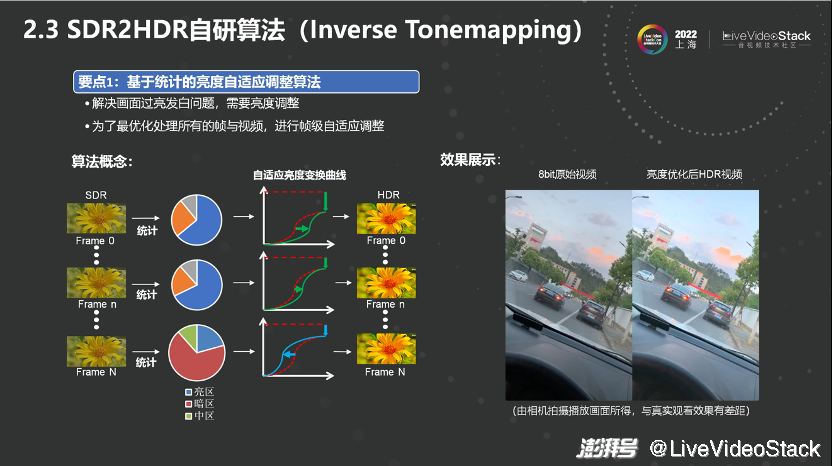 第一个是将SDR亮度对比度拉起来变成HDR亮度对比度,这里强调的是要做自适应。因为一条单独的曲线不能适应各种各样SDR场景,以及各种各样的明暗区分布,所以我们做了一个基于统计的亮度自适应调整算法。比如基于帧级来说,我们会统计每一帧的亮区、暗区、中区分布占比,占比影响转换曲线等。转换曲线是自适应的,里面有很多拐点,拐点的亮度拉多高多低,曲线最后的形态是由统计的数值而生成的。所以我们是基于每一帧的不同具体画面生成不同的转换曲线,从而生成相应的HDR达到最好效果。