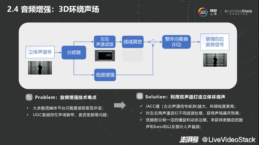 在音频增强方面,大多数流媒体平台只能获取双声道,且UGC音频存在声场狭窄、音质受损等问题。对此,我们的解决方案是利用双声道打造立体环绕声,针对左右两声道进行不同的滤波处理,获得声场展开效果,对于低频部分我们做了一定的增益和动态压缩,来获得更稳定的鼓声和bass以及部分人声的基频。