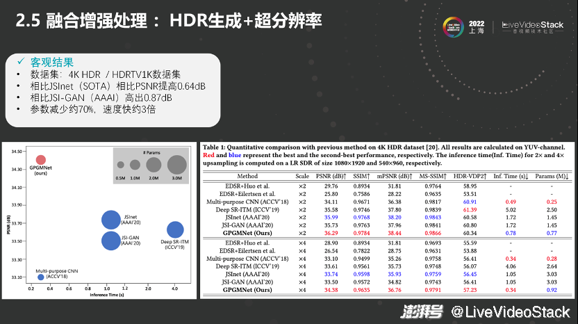 分享下结果,与业界SOTA(JSInet)相比,快手融合增强方法PSNR提升了0.64dB左右,参数减少约70%,速度快约3倍,是做的比较快且好的网络。