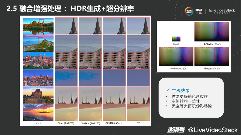 上图是效果截图,以前的SOTA结果存在有显著bad case,而我们超分辨率后bad case没有了,而且颜色和纹理都变得很清晰,体现出4K HDR该有的效果。