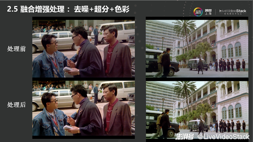 上图是一个真实案例,这是一个老港片。我们用融合算法对影片进行处理,原片中有很强的噪声,在处理后噪声少了很多,面部和背景都变得更加清晰,色彩也有所提升。