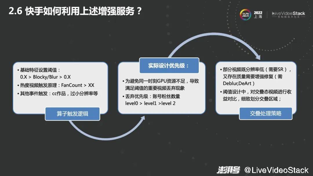 首先是算子的触发逻辑,一共有三种。第一种触发逻辑是根据技术特征、模糊程度、Blocky程度等,它会有分值,然后由分值来决定触发逻辑;第二是根据热度视频触发,对平台上全部视频应用是没有意义的,需要基于Fan Count还是View Count 这些细节去设计;第三是事件触发针对具体事件case。所以触发策略是和具体的业务形态有关系,然后根据业务去做具体的触发方式。