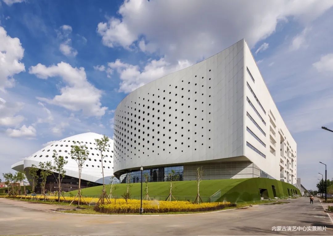 内蒙古演艺中心项目位于呼和浩特新城区北垣东街,总建筑面积38750平方米,与博物院、科技馆交相辉映,共同形成一个开放繁荣的文化圈。项目外形设计像一架打开的钢琴,内部以合成演出区、排练教学区、舞美中心区、行政办公区和公寓生活区组成,各项功能都达到了国内一流水准,成为了自治区靓丽的新名片。