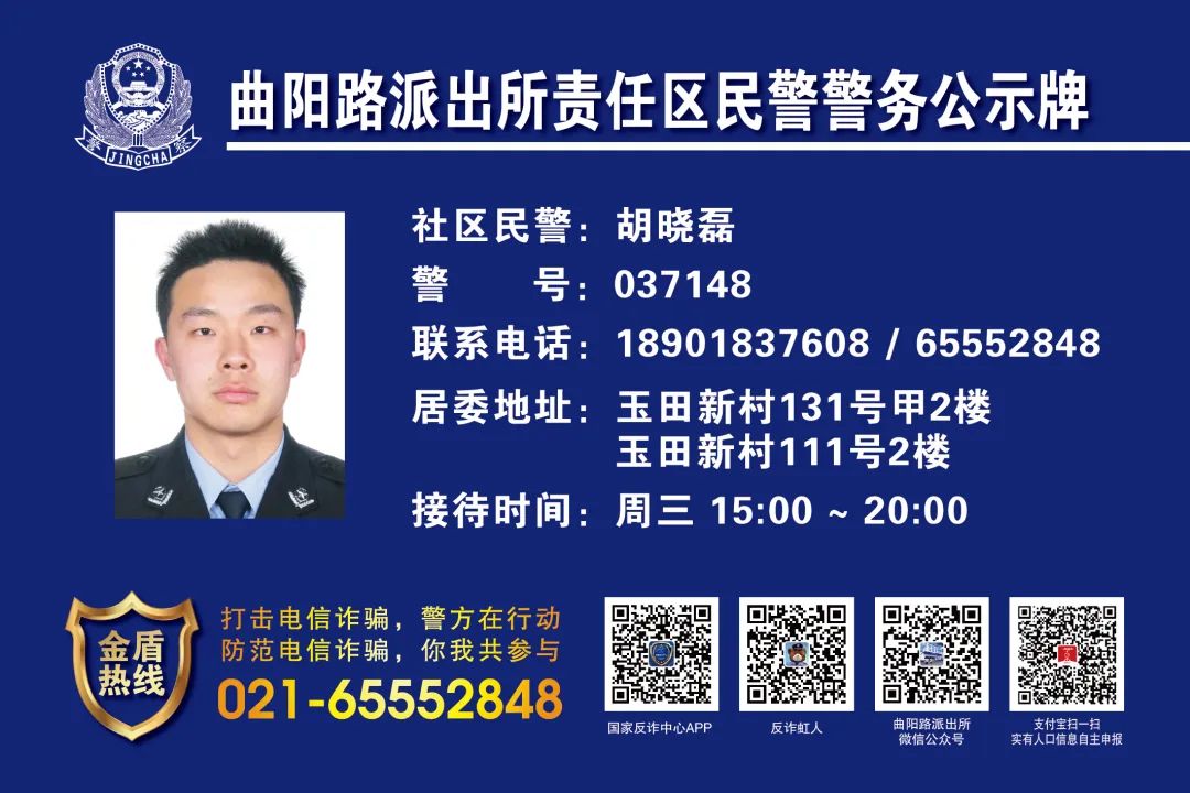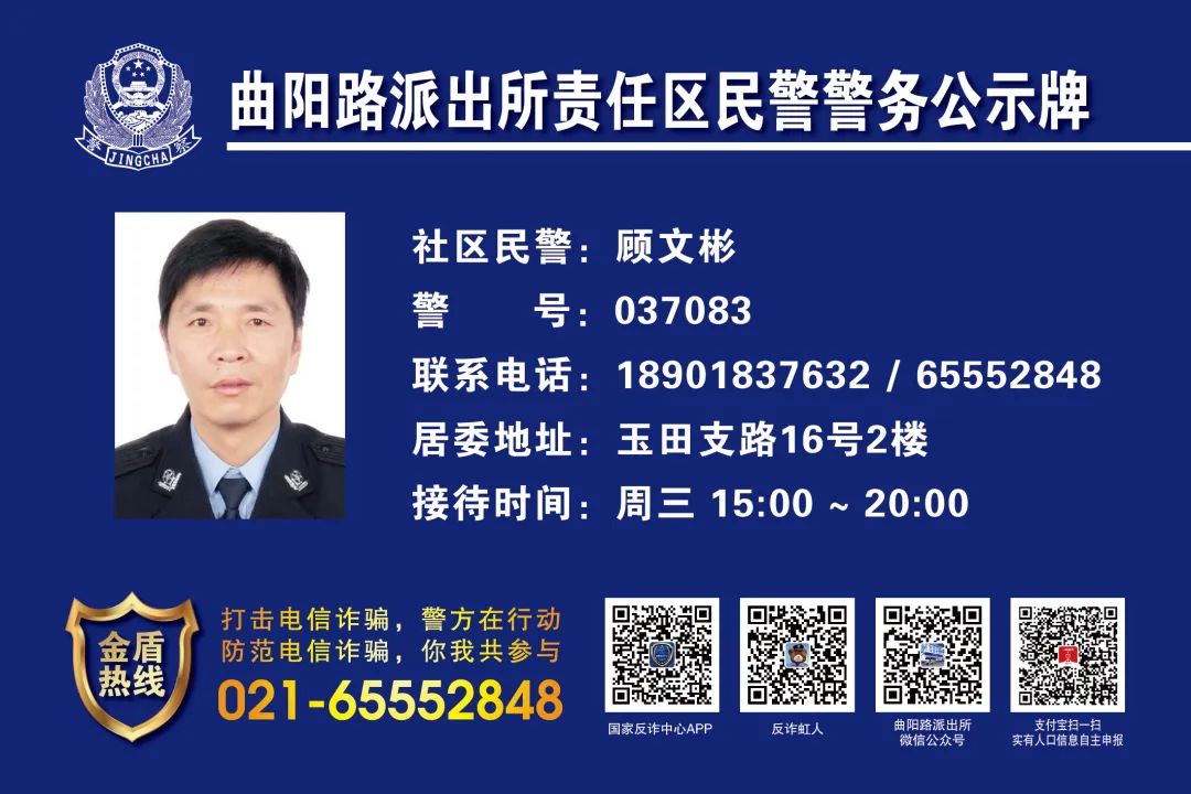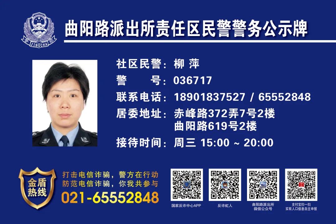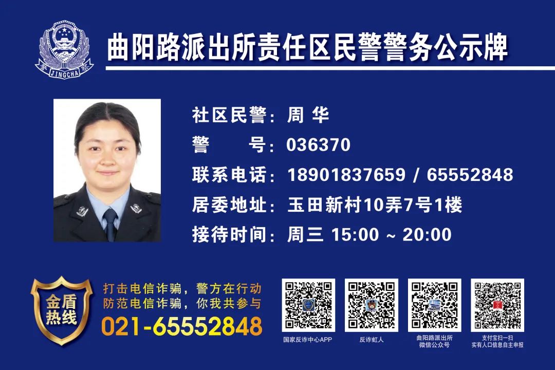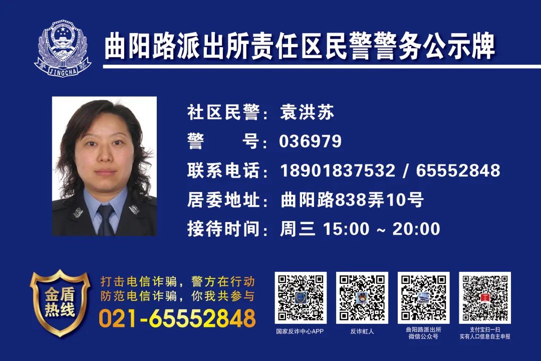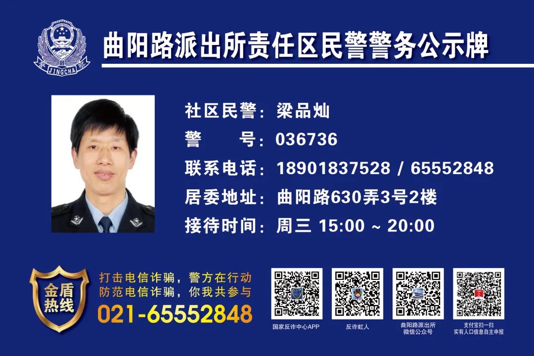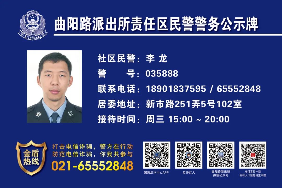 相信细心的居民朋友们已经注意到,在曲阳各小区的显眼处都贴着这样一块不一样的“牌子”——社区民警的“介绍信”。这是为进一步密切警民关系、方便辖区群众更便捷地与社区民警联系和沟通的名片,上有曲阳路派出所各社区民警的岗位信息、联系方式,同时附有曲阳路派出所24小时报案、求助和咨询电话,方便群众与警方快速联系。
