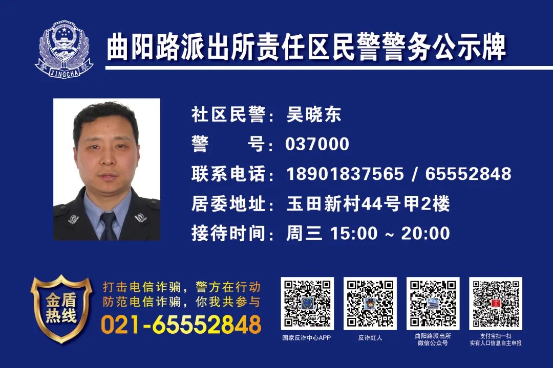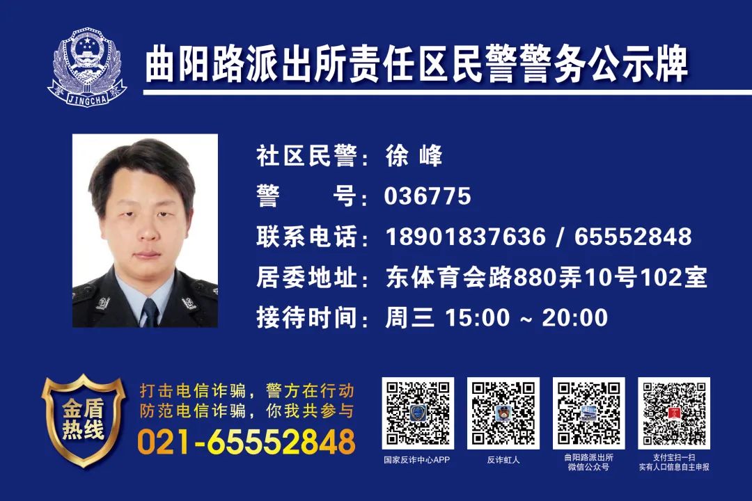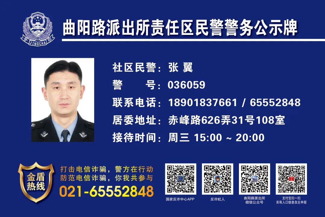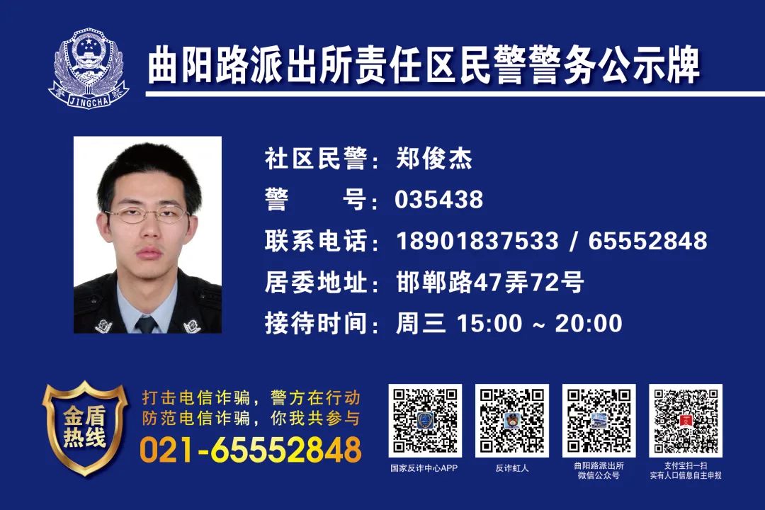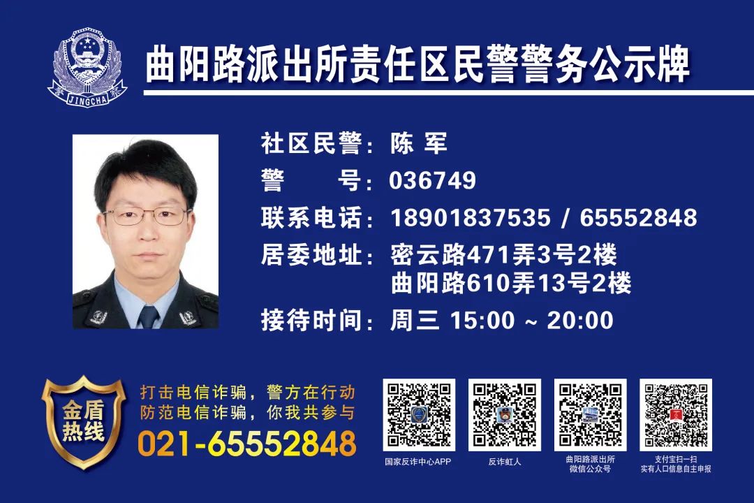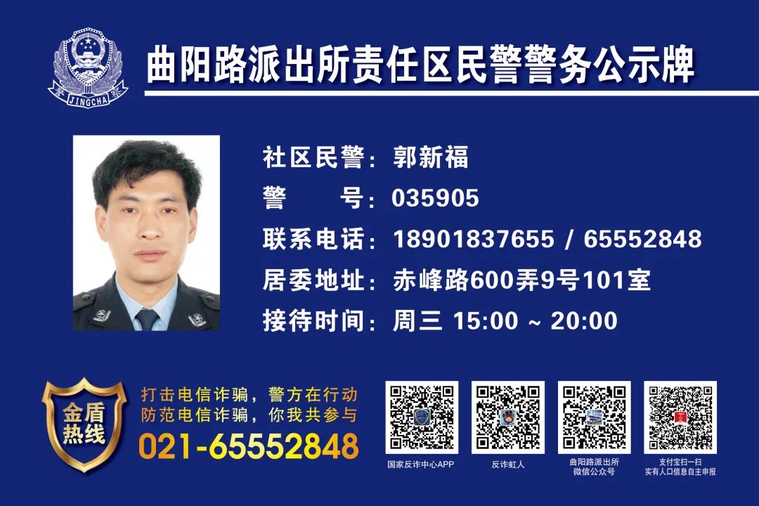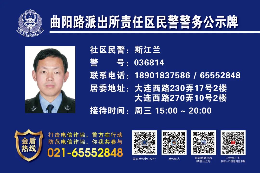 相信细心的居民朋友们已经注意到,在曲阳各小区的显眼处都贴着这样一块不一样的“牌子”——社区民警的“介绍信”。这是为进一步密切警民关系、方便辖区群众更便捷地与社区民警联系和沟通的名片,上有曲阳路派出所各社区民警的岗位信息、联系方式,同时附有曲阳路派出所24小时报案、求助和咨询电话,方便群众与警方快速联系。