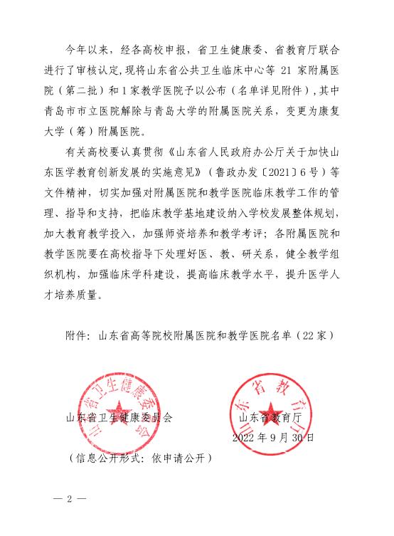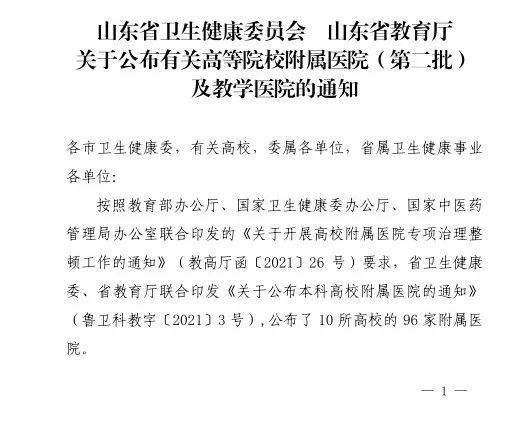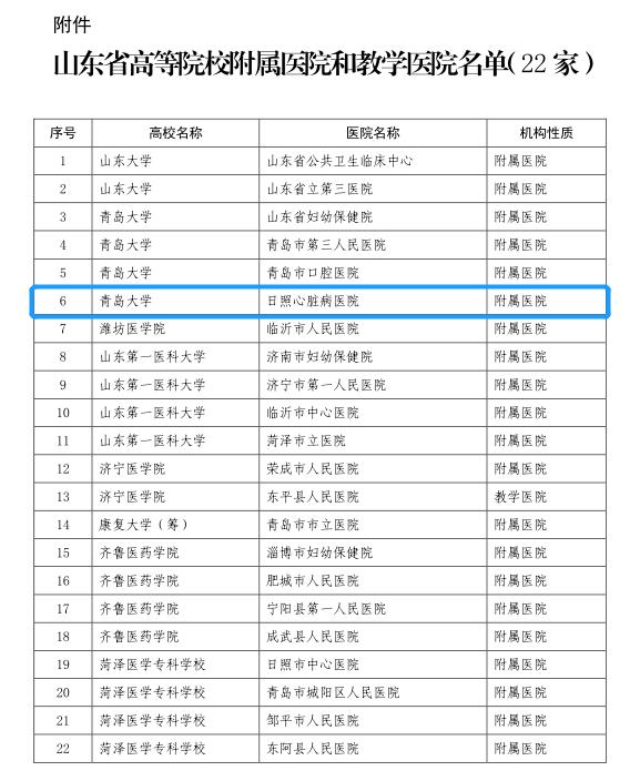 9月30日,山东省卫生健康委员会、山东省教育厅正式联合印发了《关于公布本科高校附属医院的通知》(鲁卫科教字〔2021〕3 号),公布了10所高校的96家附属医院。作为青岛大学第十二临床医学院,日照心脏病医院顺利通过复审,成为青岛大学附属医院。