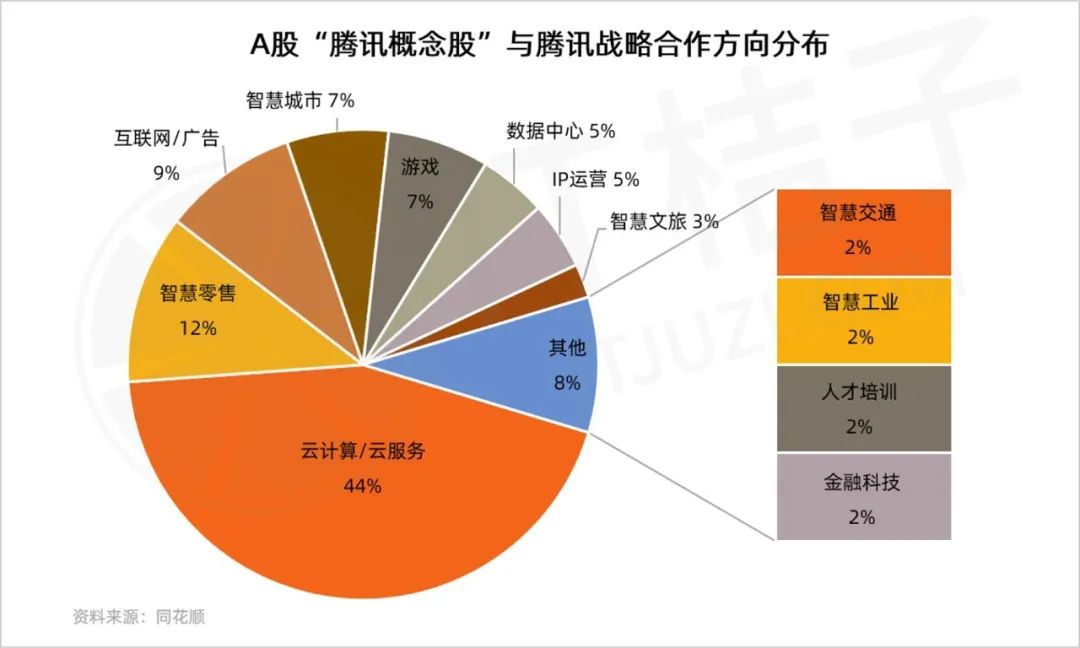如 A 股步步高、天虹股份、青岛金王与腾讯在智慧零售领域的合作;赛为智能、大恒科技、中科曙光与腾讯在云计算领域的合作;威胜信息、高新兴与腾讯在智慧城市领域的合作。也有部分为腾讯持股企业如永辉超市、东华软件、华谊兄弟、掌趣科技、世纪华通、博思软件等。