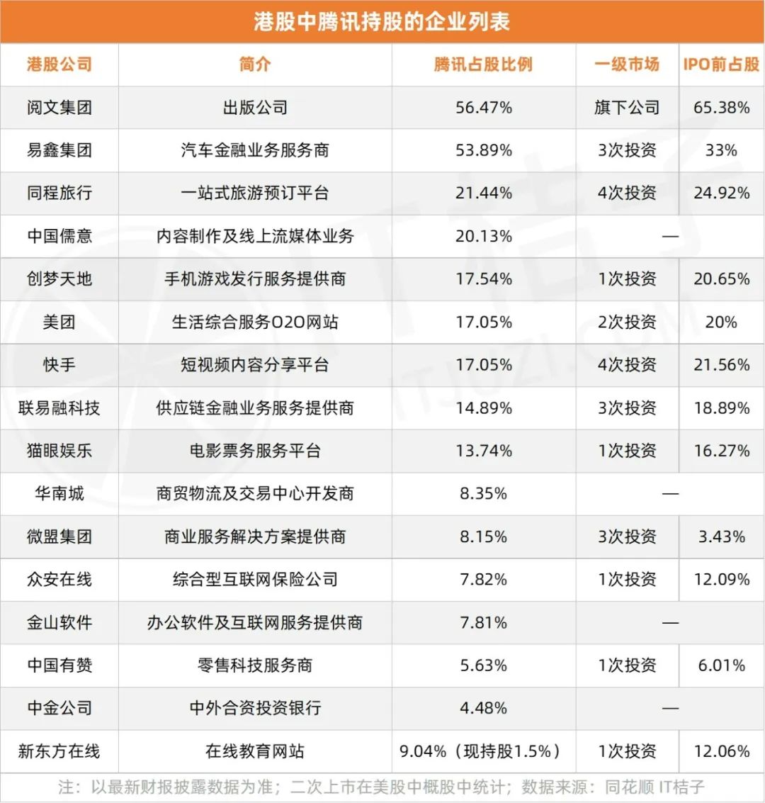 据 IT 桔子统计,中国境内赴港上市且腾讯持股的 16 家企业中,有超过 90%,腾讯在一级市场就以股权投资方式入股,阅文集团更是腾讯旗下公司,阅文集团 IPO 前,腾讯持股 65.38%,截至今年 10 月,所持股份依然超 50%。