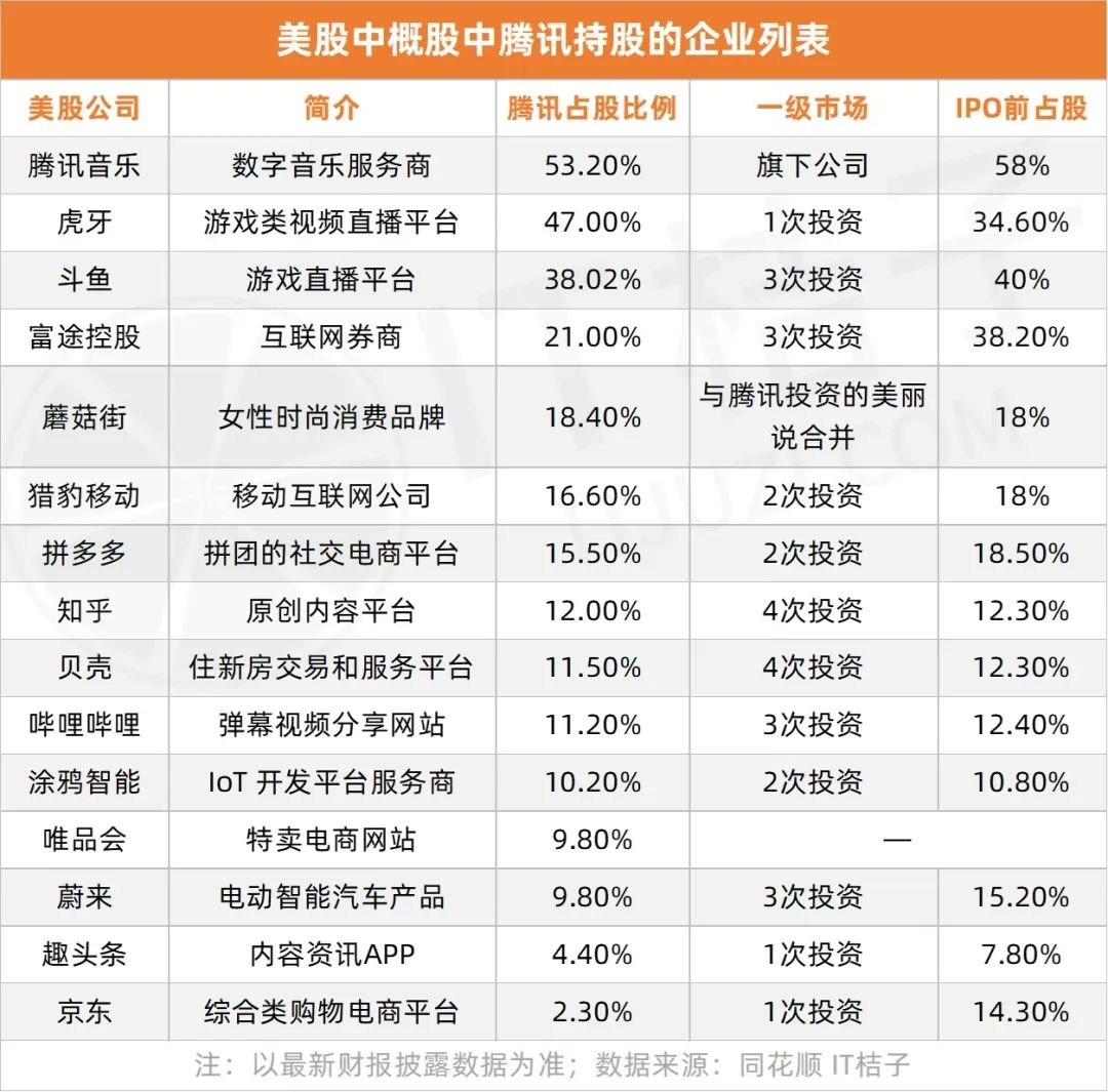 美股:腾讯持股 10% 以上的中概股超过 10 家
