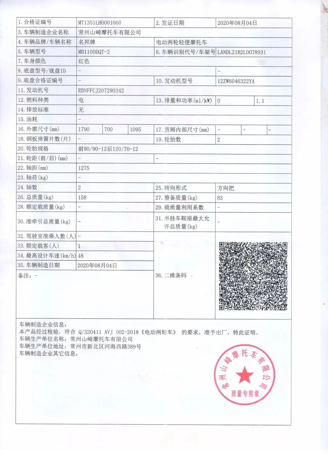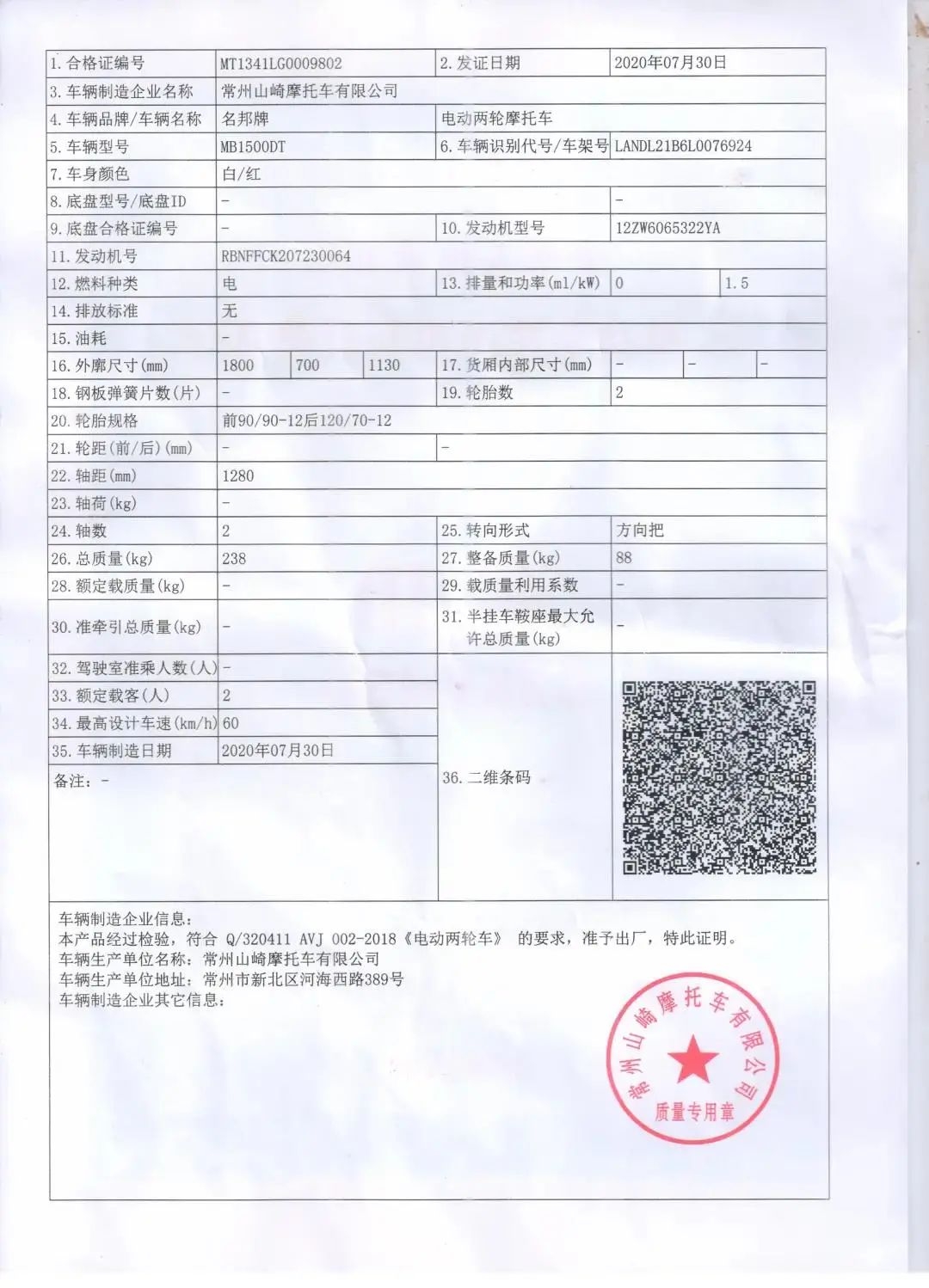 电动摩托车车架号则与汽车和普通摩托车相同为17位,无3C认证栏目。