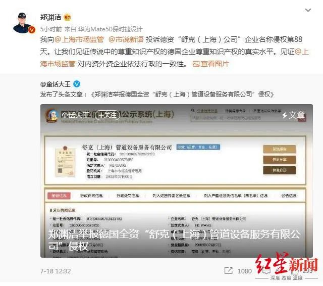 郑渊洁介绍,涉嫌侵权的企业名称为“舒克(上海)管道设备服务有限公司”,由德国企业“Franz Schuck GmbH”全资控股。使用其文学作品中“舒克”作为企业名称,容易让消费者或合作伙伴误认为跟郑渊洁有关。他的诉求就是让对方改名,或者经过授权后使用“舒克”,但不会收取任何费用。