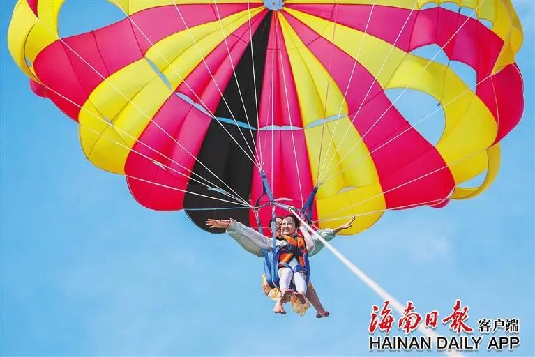 游客在三亚蜈支洲岛旅游区体验彩虹拖伞。海南日报记者 武威 摄
