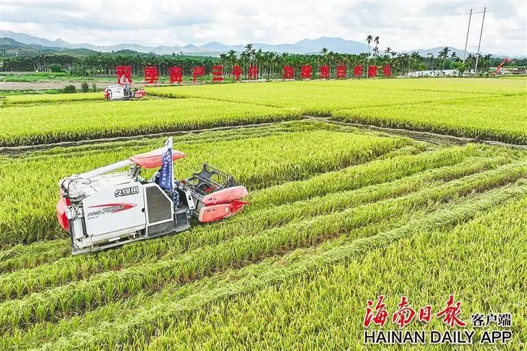 三亚把发展种业科技放在突出位置,积极开展种源“卡脖子”技术攻关,全力推进“南繁硅谷”建设,赋能打赢种业翻身仗。图为5月6日,在三亚市崖州区(坝头)南繁公共试验基地试验示范点稻田,收割机在收割早稻。海南日报记者 武威 摄