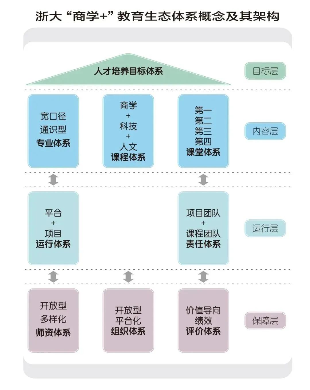 2020年底,浙大管院在“商学+”教育模式实践基础上,进行了再度升级,提出了“‘商学+’教育生态系统”,并以此构建系统架构。其基本思路就是建设起“目标—内容—运行—保障”四层次系统,具体涵盖九大子体系。